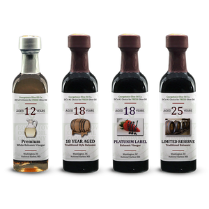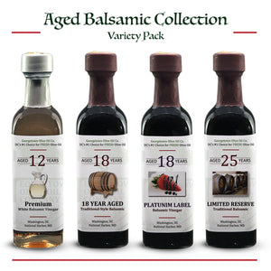 Aged Balsamic Collection - In this box we included 4 balsamic vinegars with different flavor profiles, aromas and thickness. They are all wonderful over steak, pork and poultry, added to pasta sauce or drizzled over risotto, or tossed with oil and salad greens. Aged Balsamic vinegar is among the most prized of Italian elixirs, crafted from Trebbiano grapes and aged in wooden barrels according to time-honored techniques. The traditional balsamic aging gives this ultra-versatile condiment an intense and very complex flavor.