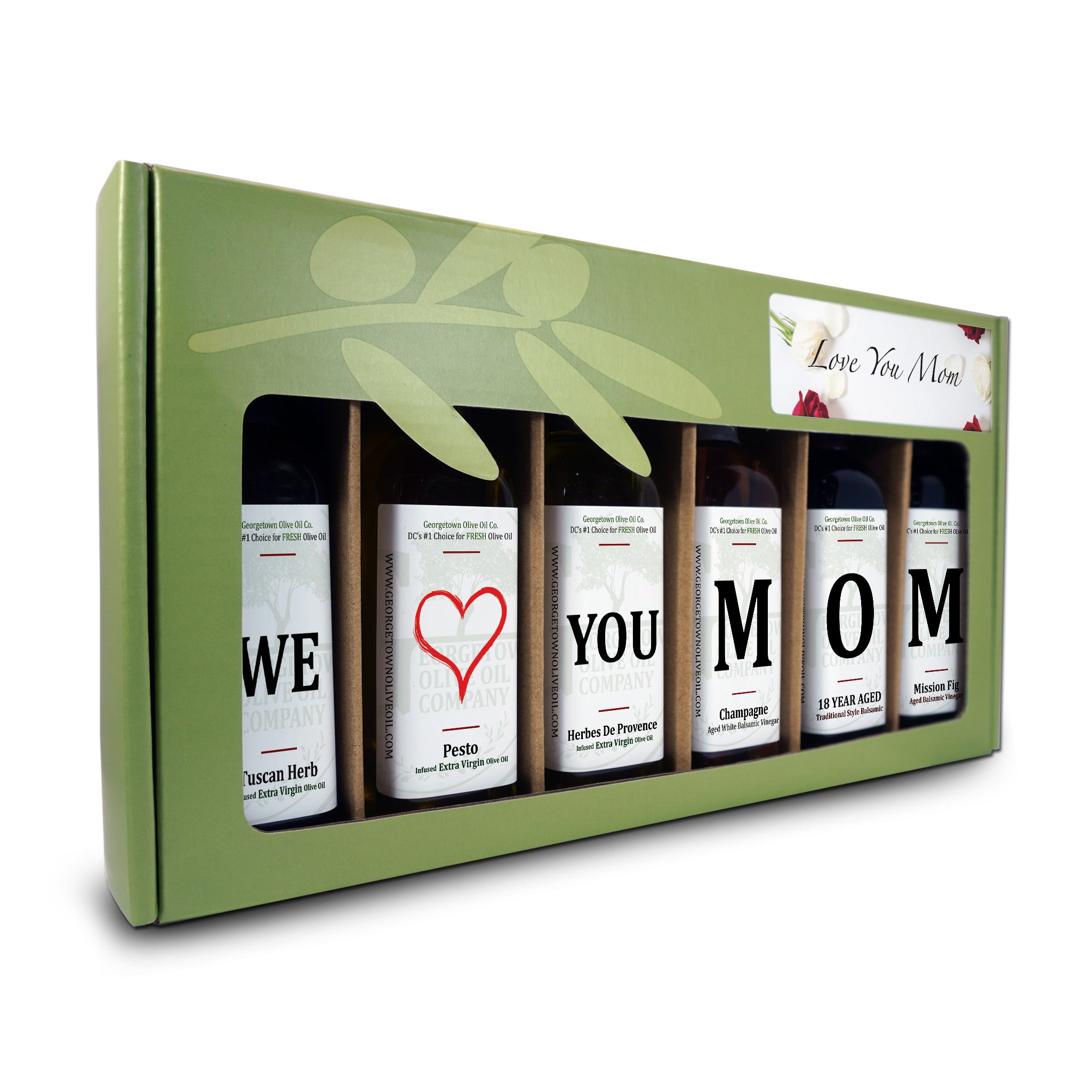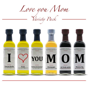 Love You Mom Oil and Vinegar Variety Pack - Surprise your mom with party-perfect mini bottle gift set! Our sampler showcases a trio of infused extra virgin olive oils and three bottles of aged balsamic. Great for drizzling on vegetables and fish, dressing salads, dipping bread or marinating poultry and red meats.
