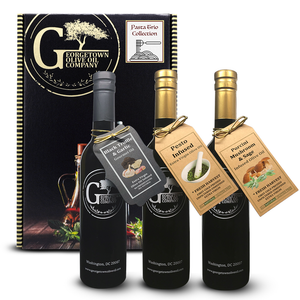 Pasta Trio - Olive Oil Gift Collection - this selection contains an assortment of three extra virgin olive oils and it is perfect for anyone wishing to explore some tasty Mediterranean flavors. Assorted in a  box this trio makes a versatile gift for cooks and pasta lovers alike. Also use to finish steak, eggs, potatoes and more.