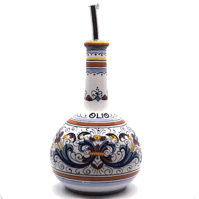 This Olive Oil bottle represents a classic Renaissance pattern of scrolls, florals and fruit and is completely hand painted in Deruta, Italy. It represents one of Deruta`s most popular Renaissance patterns. This comfortable, one handle bottle is elegant and easy to use while cooking and entertaining. It comes with a spout for easy dispensing of your olive oil. It is a must have cooking essential, crafted finest quality Italian Majolica.