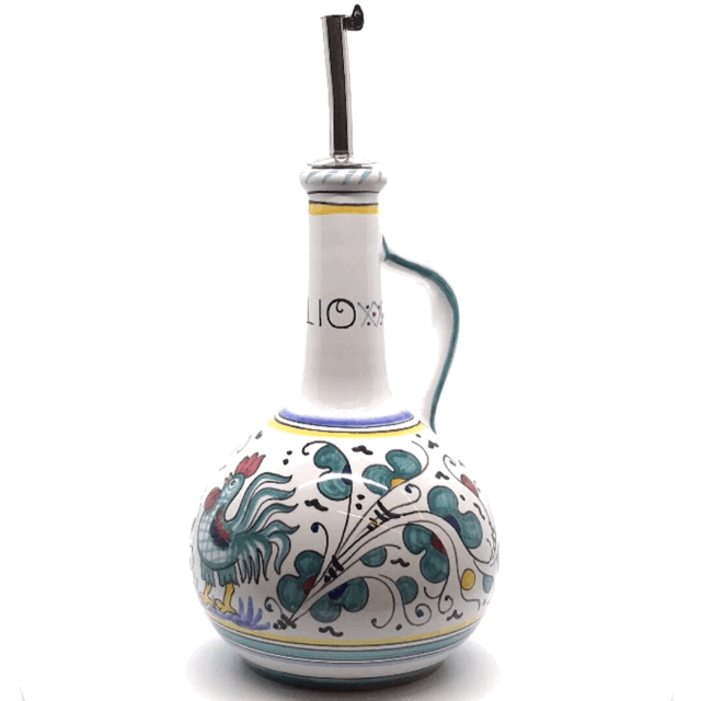 This Olive Oil bottle represents one of Deruta`s most popular Renaissance patterns featuring a Rooster - symbol of prosperity and good wishes. It is hand-painted with magnificent attention to detail. This comfortable, one handle bottle is elegant and easy to use while cooking and entertaining. It comes with a spout for easy dispensing of your olive oil. It is a must have cooking essential, crafted finest quality Italian Majolica. We carry this pattern in Green, Blue and Red.