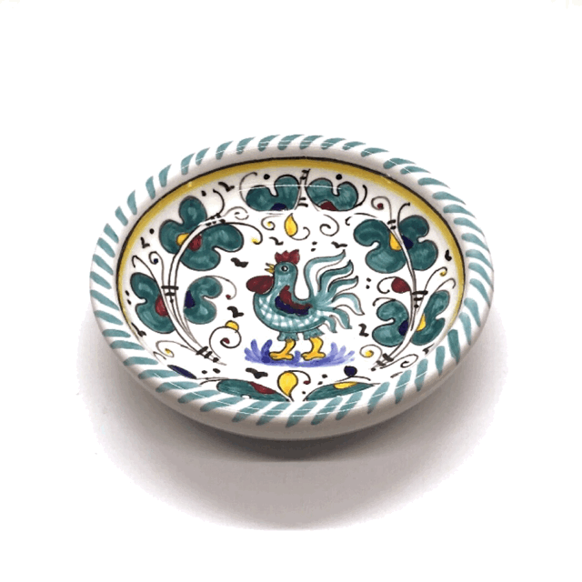 Orvieto is another traditional Italian pattern that originated during the Renaissance and is inspired by paintings of animals on Italian Majolica. This charming pattern features a Rooster - symbol of prosperity, blessings and good wishes. Masterfully hand-painted in Deruta, Italy, and perfectly shaped for seasoned olive oil dipping it will bring elegance to your table. We carry this pattern in Green, Blue and Red.