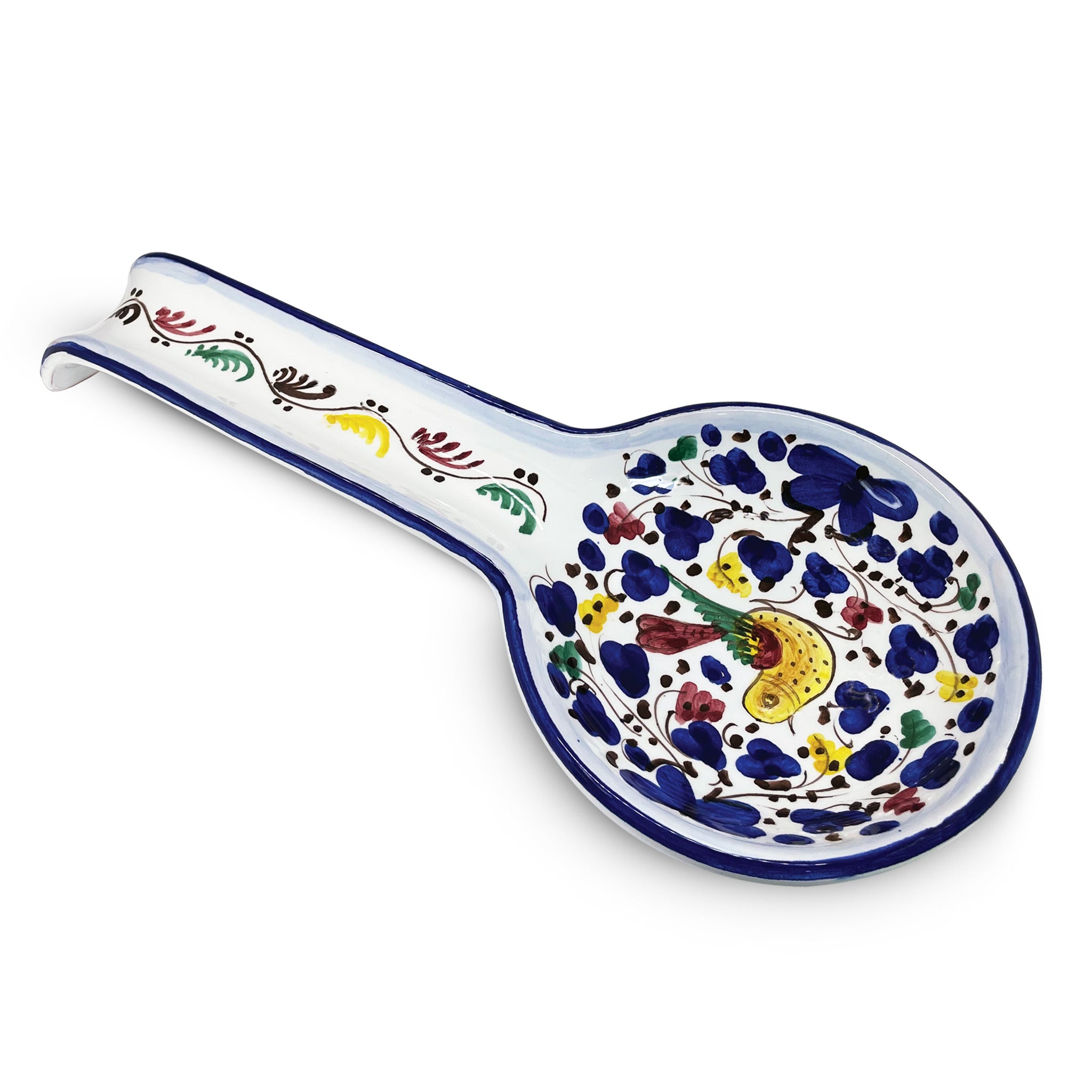 Spoon Rest ARABESCO - This Deruta spoon rest is hand crafted and hand painted. It is designed from extra thick Majolica Ceramic with the hostess in mind and generously sized to fit large utensils. It will hold your cooking utensils and keep your counter and table mess-free.
