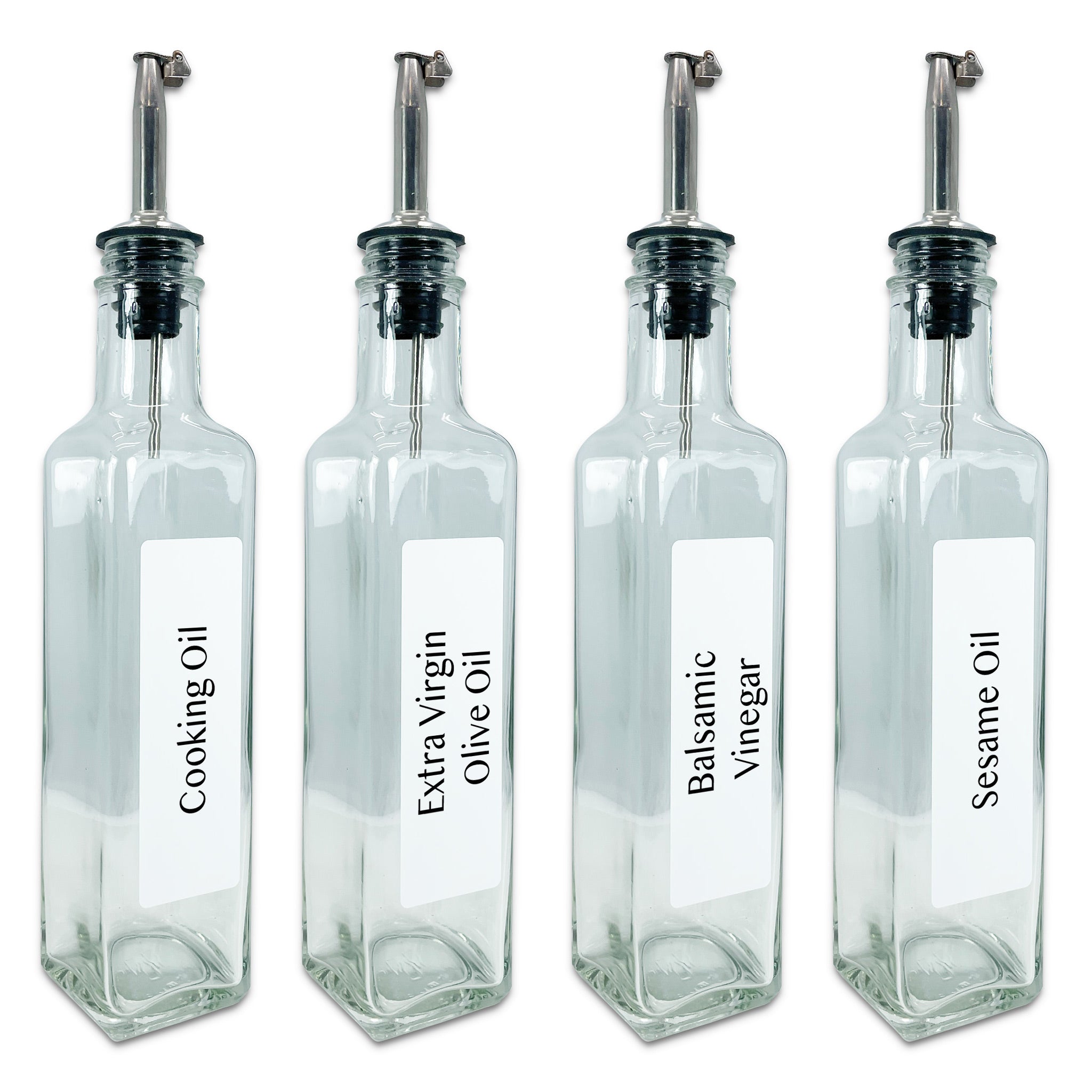 Choose exactly what you need: Cooking Oil, Extra Virgin Olive Oil, Balsamic Vinegar, or Sesame Oil — or elevate your entire kitchen setup with the full matching set. The modern square design keeps the bottles stable and stylish on your counter, while the clean labels make it easy to grab the right ingredient every time.