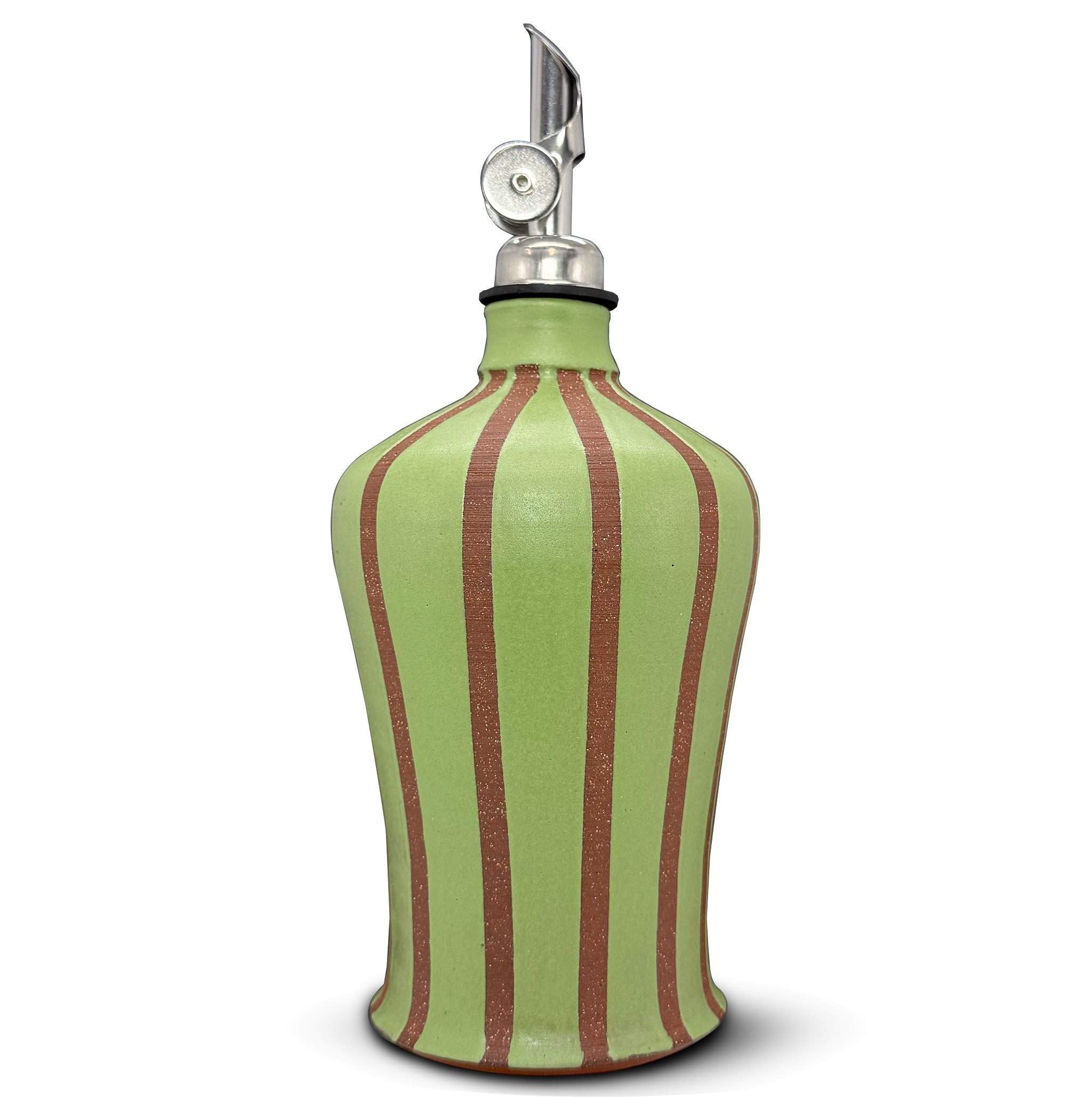 Handmade Olive Oil Cruet – Sage Stripe- Elevate your kitchen with the Handmade Olive Oil Cruet – Sage Stripe, a beautifully crafted piece made by Northern Virgina artisan using locally sourced clay. This design features a soft sage-green matte glaze accented by warm terracotta-colored vertical stripes, creating a fresh, organic look that pairs perfectly with rustic, modern, or farmhouse-style kitchens.