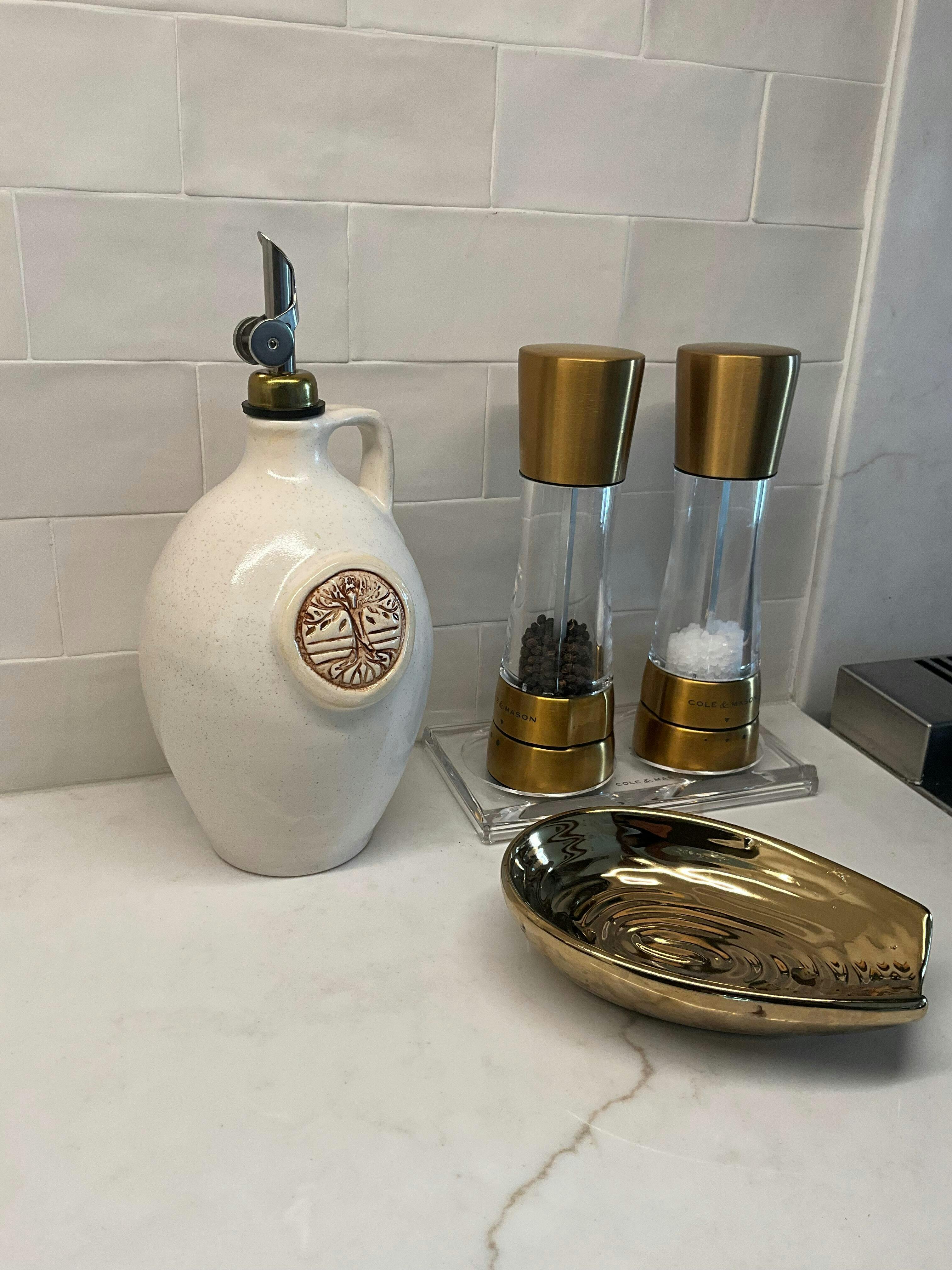 Handmade Olive Oil Cruet - Vanilla Bean 750ml - These cruets are handmade in North Carolina of locally resourced materials. They are food-safe, decorated with lead-free glazes, designed to withstand a wide range of temperatures.