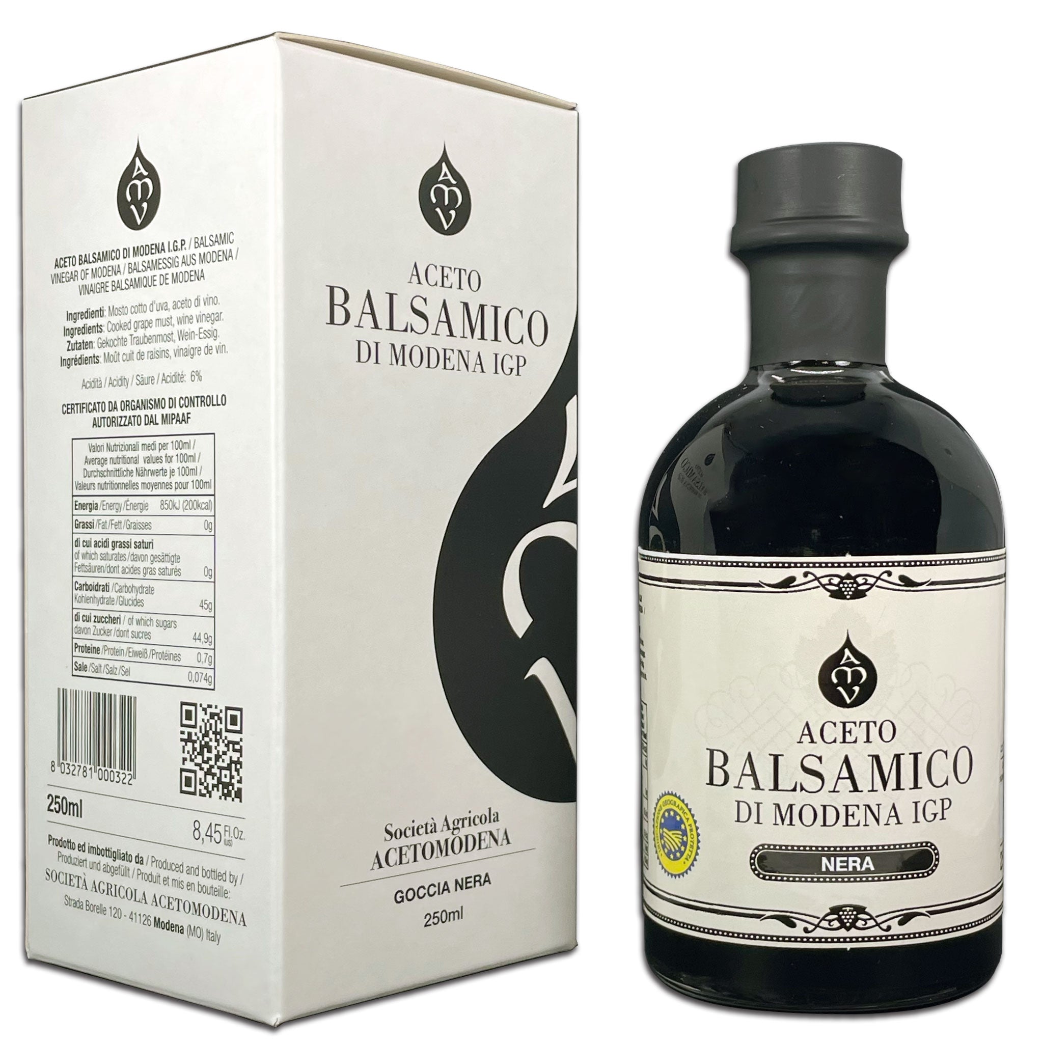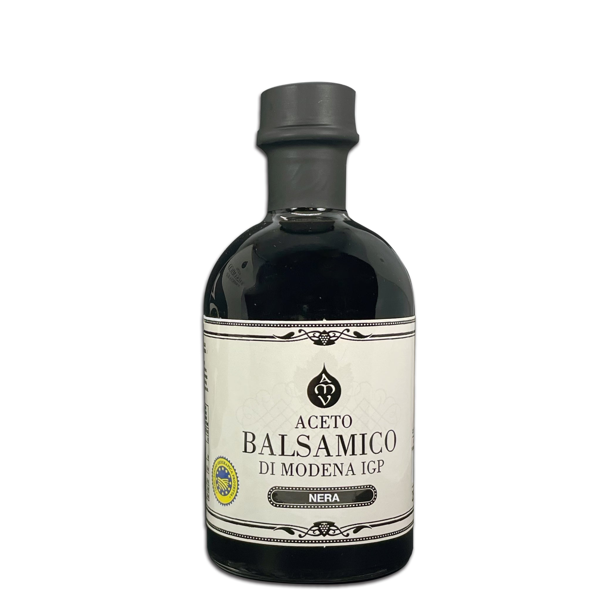Aceto Balsamico Di Modena IGP - NERA 250ml Aceto Modena delivers this IGP balsamic to America. The Nera is of higher quality and tastes better than most regular Modena IGP balsamic vinegar. An Indicazione Geografica Protetta (IGP) award links the quality of a product with the place or region where it is produced, processed, or prepared.