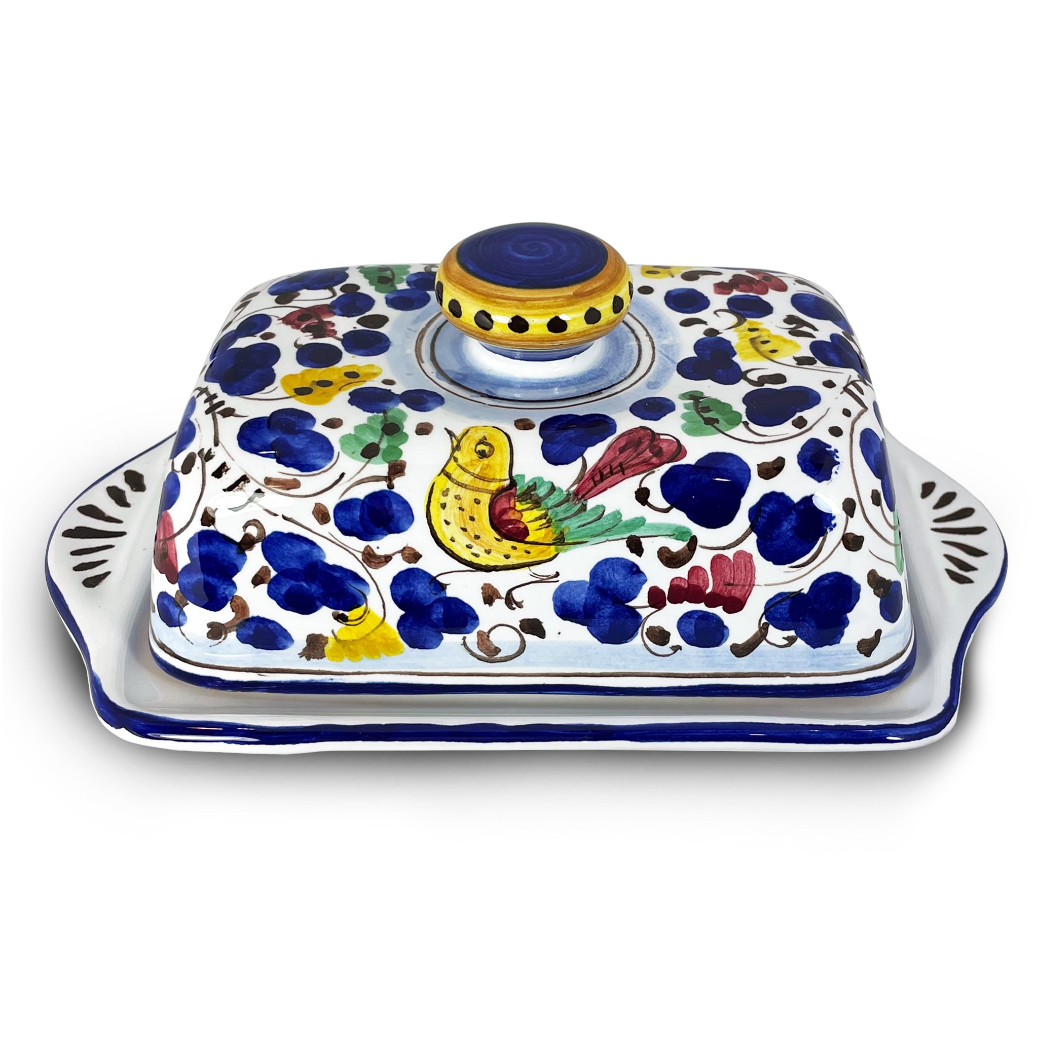 Butter Dish ARABESCO - This elegant butter dish is an entertainment must have for your next get together with family and friends. Designed from extra thick Majolica Ceramic with the hostess in mind, this covered dish holds softened butter for serving. It is handcrafted in Deruta, Italy and features traditional artwork, it also coordinates beautifully with a range of tableware and linens.