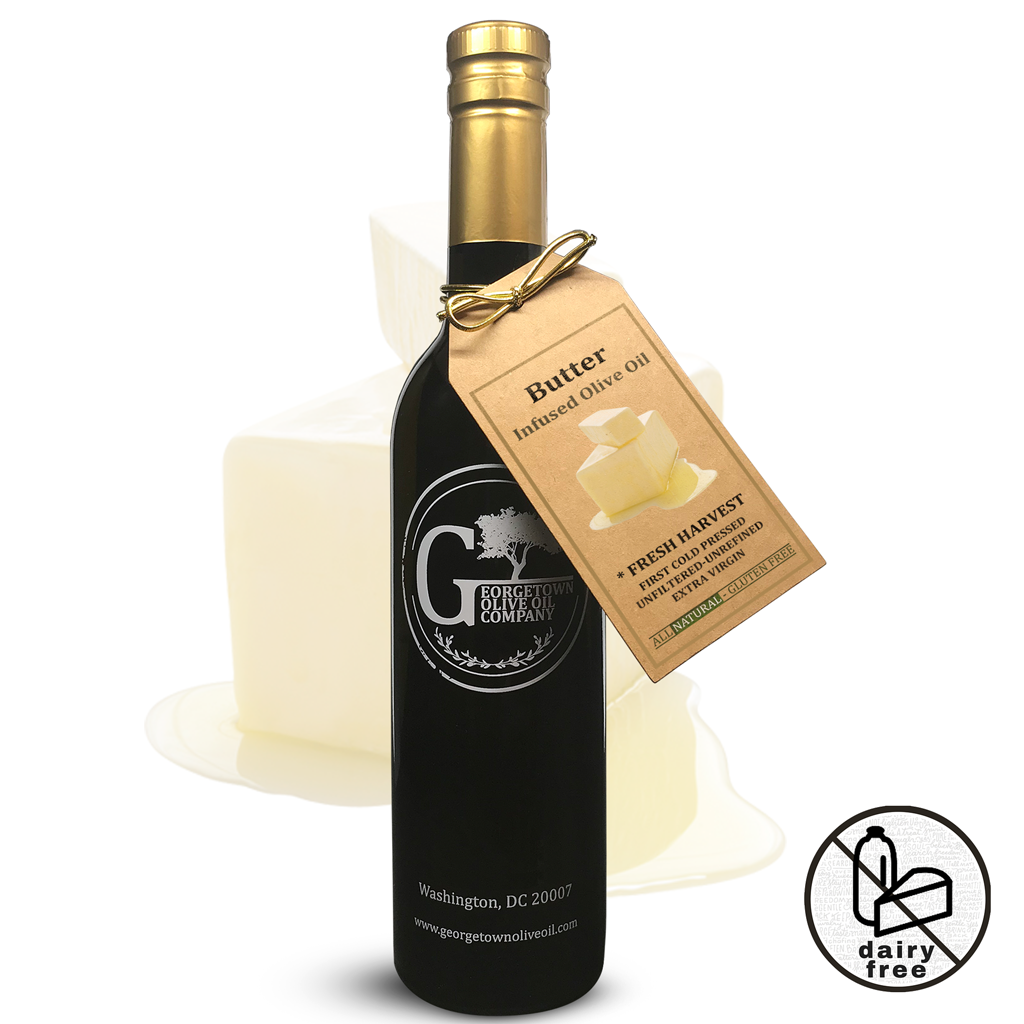 BUTTER Infused | High Polyphenols Extra Virgin Olive Oil - our favorite creamy, vegan, heart-healthy, dairy-free butter substitute. Great for use when baking, cooking, and spreading. It gets its rich butter flavor strictly from organic botanical infusions.