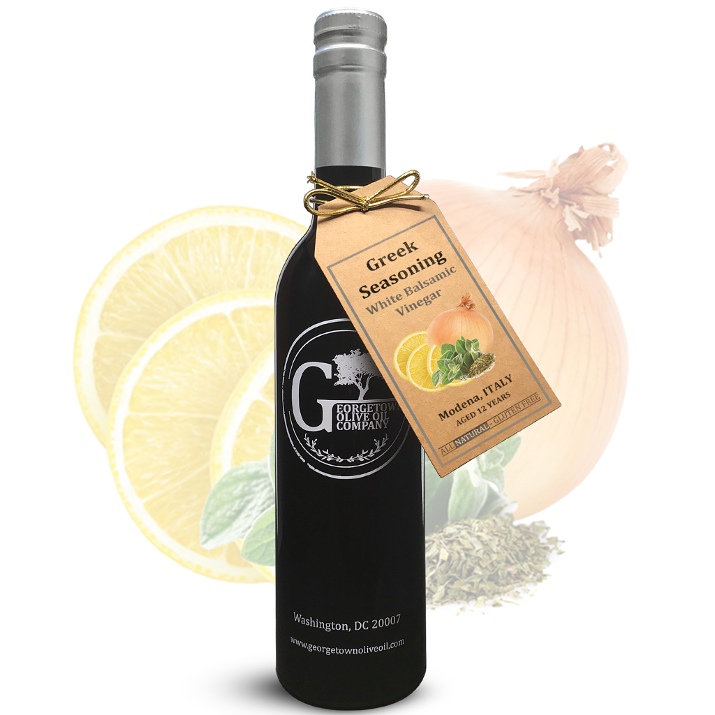 Greek Seasoning White Balsamic - This white balsamic is Infused with simple Mediterranean kitchen staples: Oregano, Lemon and Onion. It is perfect drizzled on chicken, fish, veggies and it's a great addition to salads and dressings.