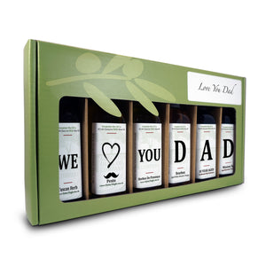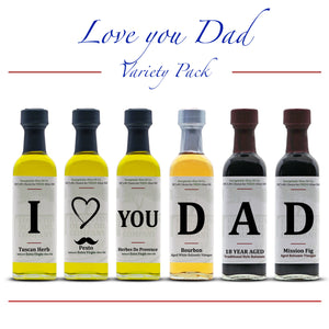 Love You Dad Oil and Vinegar Variety Pack - Surprise your dad with party-perfect mini bottle gift set! Our sampler showcases a trio of infused extra virgin olive oils and three bottles of aged balsamic. Great for drizzling on vegetables and fish, dressing salads, dipping bread or marinating poultry and red meats.