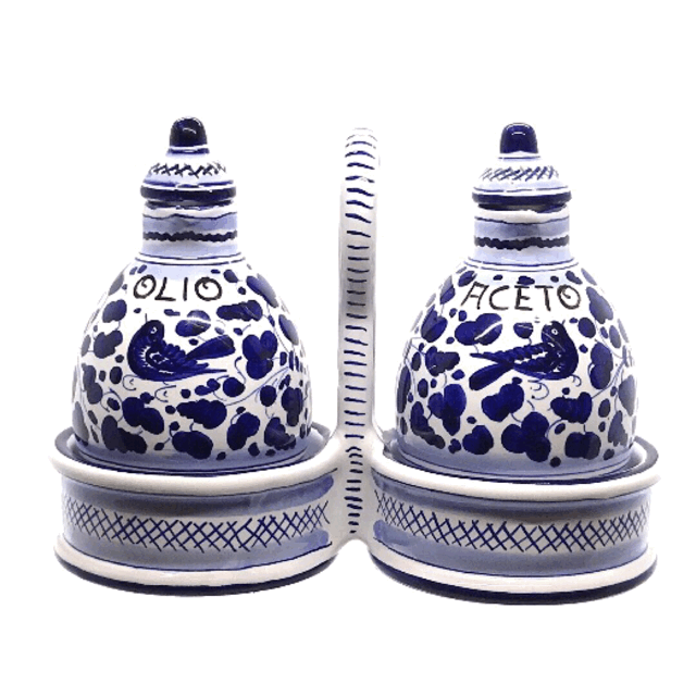 This beautiful Olive Oil and Vinegar Set allows you to add flavor to your dishes in European Style. The caddy features a comfortable handle for easy transport to your table.