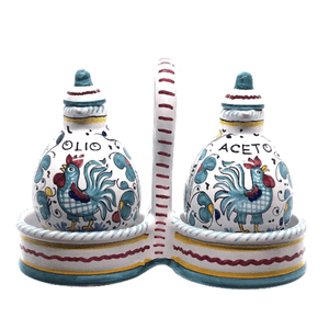 This beautiful Olive Oil and Vinegar Set allows you to add flavor to your dishes in European Style. The caddy features a comfortable handle for easy transport to your table.