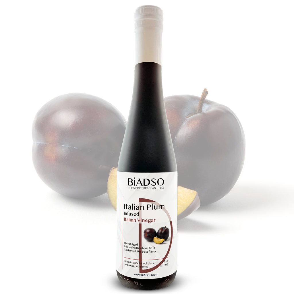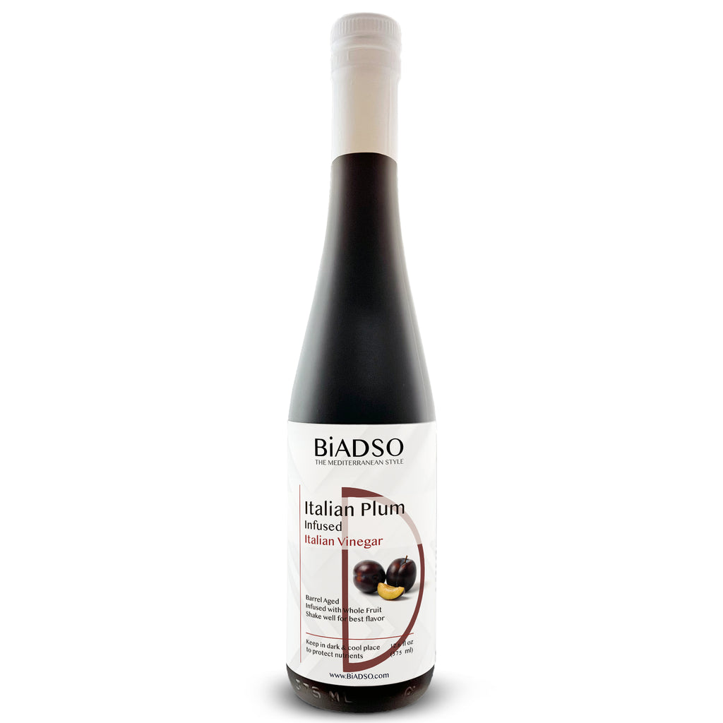Italian Plum Infused Vinegar - Biadso - The deep, red fruit of fresh Italian plums gives this whole fruit vinegar a multifaceted flavor with sweet and sour aromas. This vinegar is great for Asian influenced cuisine or fusion inspired recipes. The result when combined with Roasted Walnut Oil or Toasted Sesame Seed Oil, is a complex vinaigrette or marinade that is at once sweet, tangy, and rich. Pair it with any EVOO to dress a salad made with tender greens, freshly-cut stone fruit, and roasted pine nuts.