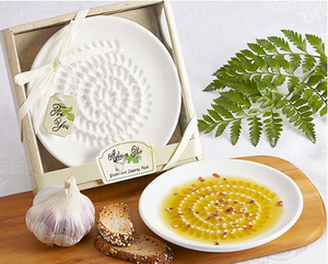 Bread Dipping Plate with Garlic Grater - European-themed dipping plate features functional center-raised ridges for grating garlic or your favorite EVOO pairings. Grate flavorings such as ginger, shallots, nutmeg, nuts, chocolate, hard cheeses, fruits, and vegetables. Also, try zesting citrus fruits. Get complete flavor extraction without waste and all the health benefits! Now, get ready to pour your finest extra virgin olive oil and go ahead and take it to the next level by drizzling your best balsamic vinegar, too! You’re ready to dip into your extraordinary all-natural recipe with your finest crusty bread and let the taste transport you to foodie heaven.
