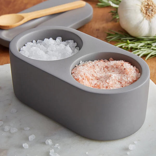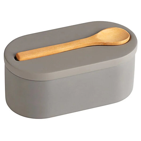 Cement Salt Cellar with Stainless Steel Spoon - upgrade your kitchen with this 6 5/8" x 2 7/8" x 2 3/8" Cement Salt Cellar, designed for style, durability, and functionality. This versatile salt cellar is perfect for storing salt and other dry spices, combining practicality with an attractive appearance to enhance your cooking experience.