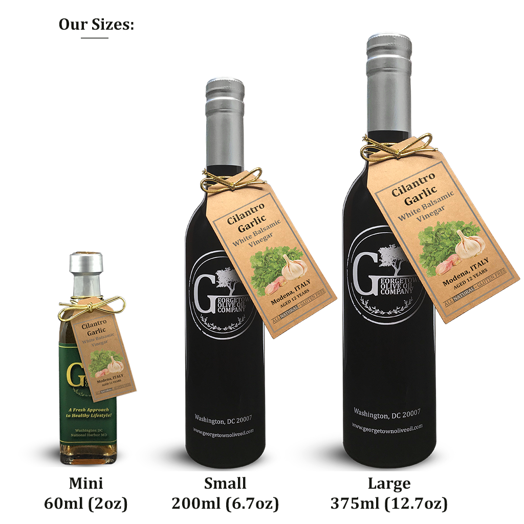Cilantro Garlic White Balsamic Vinegar - the intense aroma and flavor of freshly chopped cilantro is mixed with a touch of roasted garlic. The balance of savory, sweet, earthy, and floral with a sharp midpoint and soft, lingering finish is sure transform your dish.