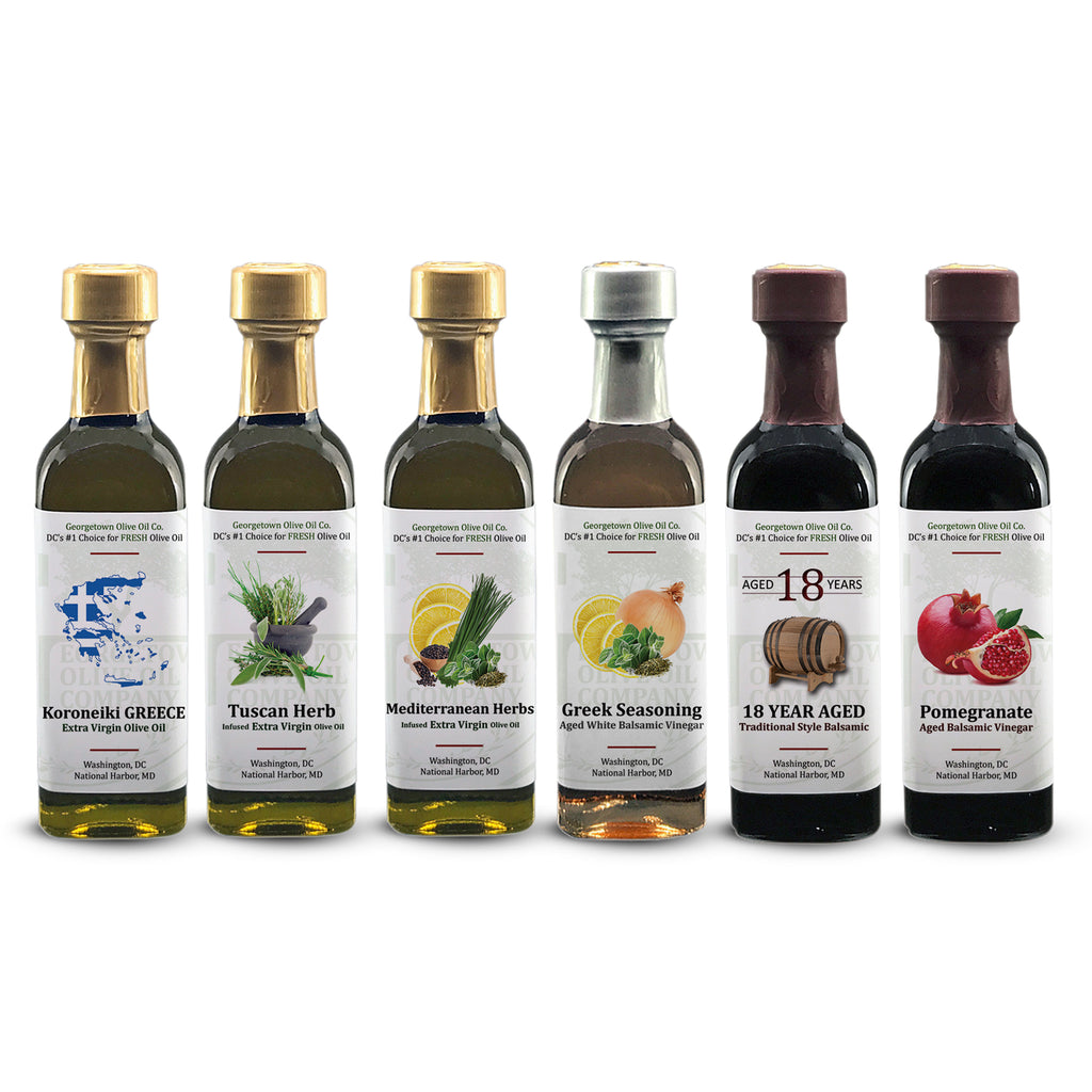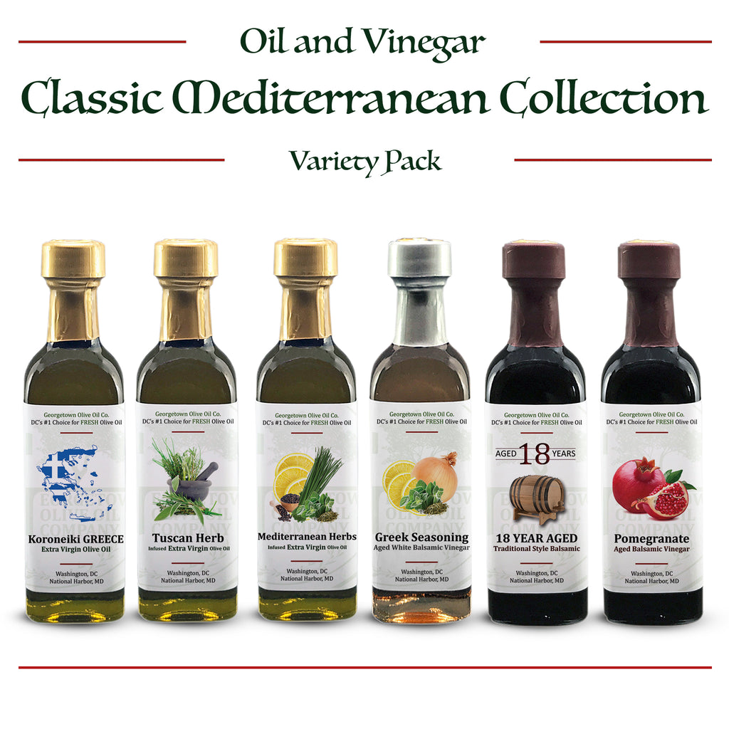 Classic Mediterranean Collection - Surprise your favorite foodie with our party-perfect mini bottle gift set! Our sampler showcases a trio of infused extra virgin olive oils and three bottles of aged balsamic. Great for drizzling on vegetables and fish, dressing salads, dipping bread or marinating poultry and red meats.