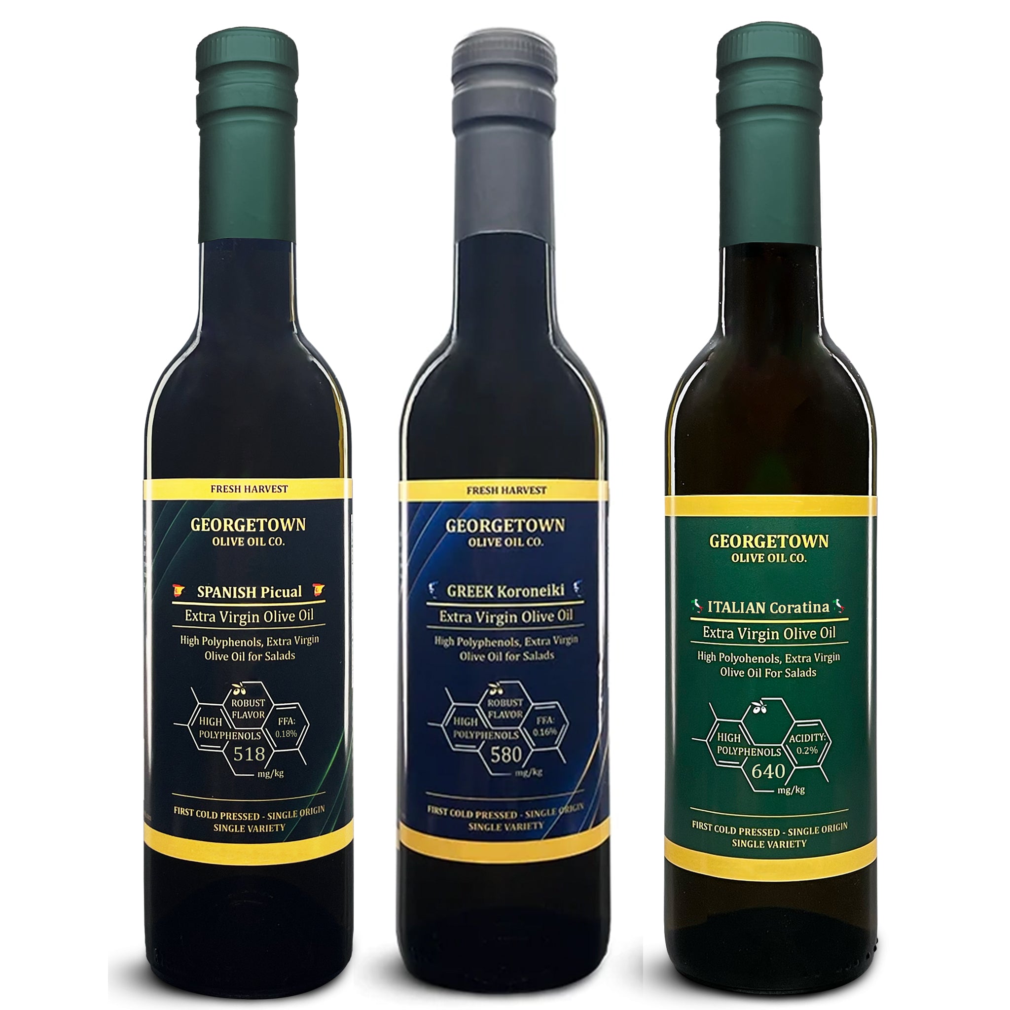 Extra Virgin Olive Oil TRIO | Spain, Greece and Italy - Experience the taste and health benefits of three of the world's finest high polyphenol extra virgin olive oils! These three exquisite bottles from Spain, Greece, and Italy will enrich your salads and everyday cooking with incredible flavor and powerful nutrients. Enjoy the best of Europe in every drop!