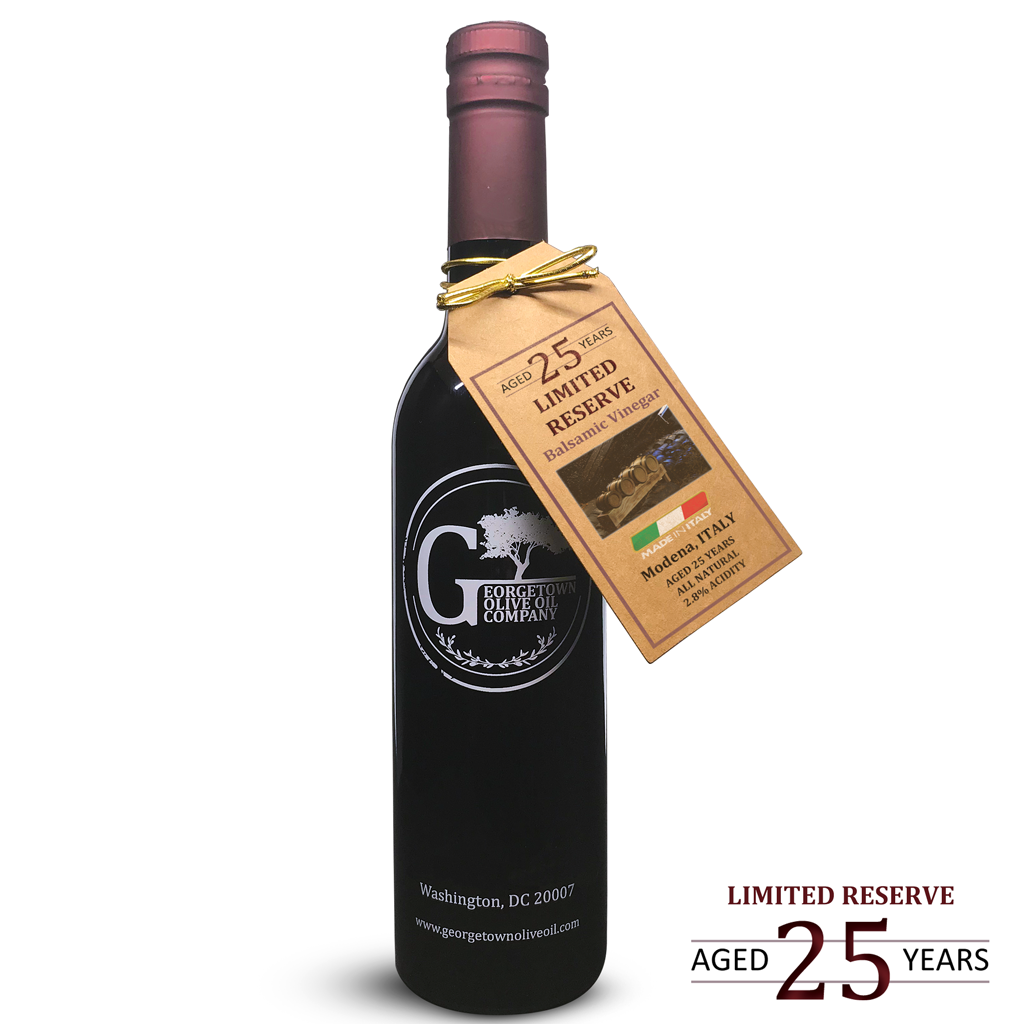 25 YEAR AGED Limited Reserve Balsamic is made from Trebbiano grape and is slowly aged in five different casks, comprised of mulberry, ash, oak, juniper and cherry wood. It's extremely complex and bursting with flavor. Serve with your finest cheese plates, drizzle over melon or berries, use as a finishing glaze for roasted meats and poultry, drizzle over your grilled vegetables or dessert.