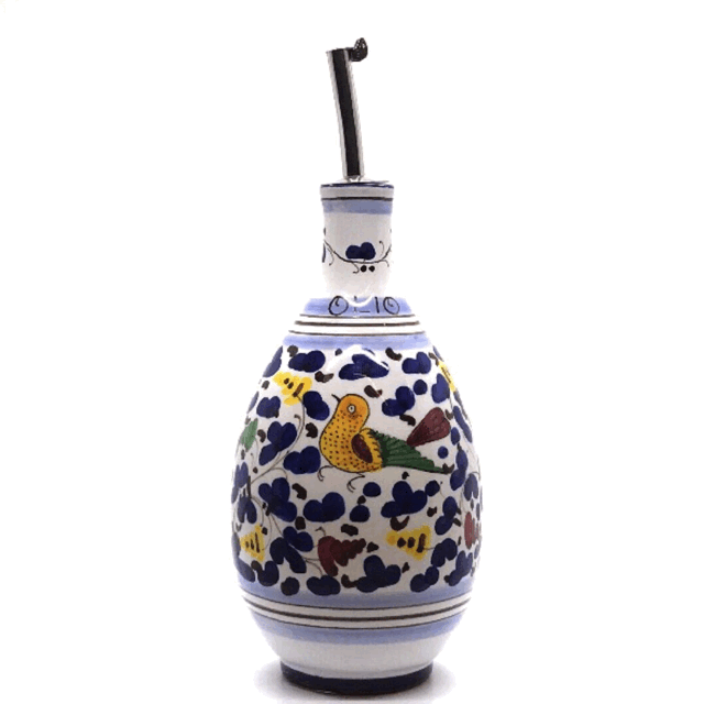 This Olive Oil bottle features the classic Renaissance Arabesco - the Whimsical Bird. It is completely hand painted in Deruta, Italy. It represents one of Deruta's most popular Renaissance patterns. This comfortable, ergonomic pot-belly bottle is elegant and easy to use while cooking and entertaining. It comes with a spout for easy dispensing of your olive oil. It is a must have cooking essential, crafted finest quality Italian Majolica.