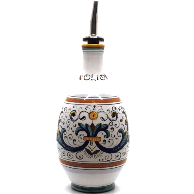 This Olive Oil bottle represents a classic Renaissance pattern of scrolls, florals and fruit and is completely hand painted in Deruta, Italy. It represents one of Deruta's most popular Renaissance patterns. This comfortable, ergonomic pot-belly bottle is elegant and easy to use while cooking and entertaining. It comes with a spout for easy dispensing of your olive oil. It is a must have cooking essential, crafted finest quality Italian Majolica.