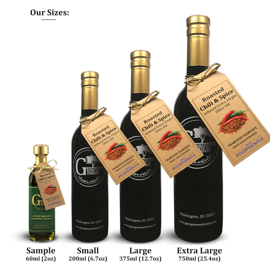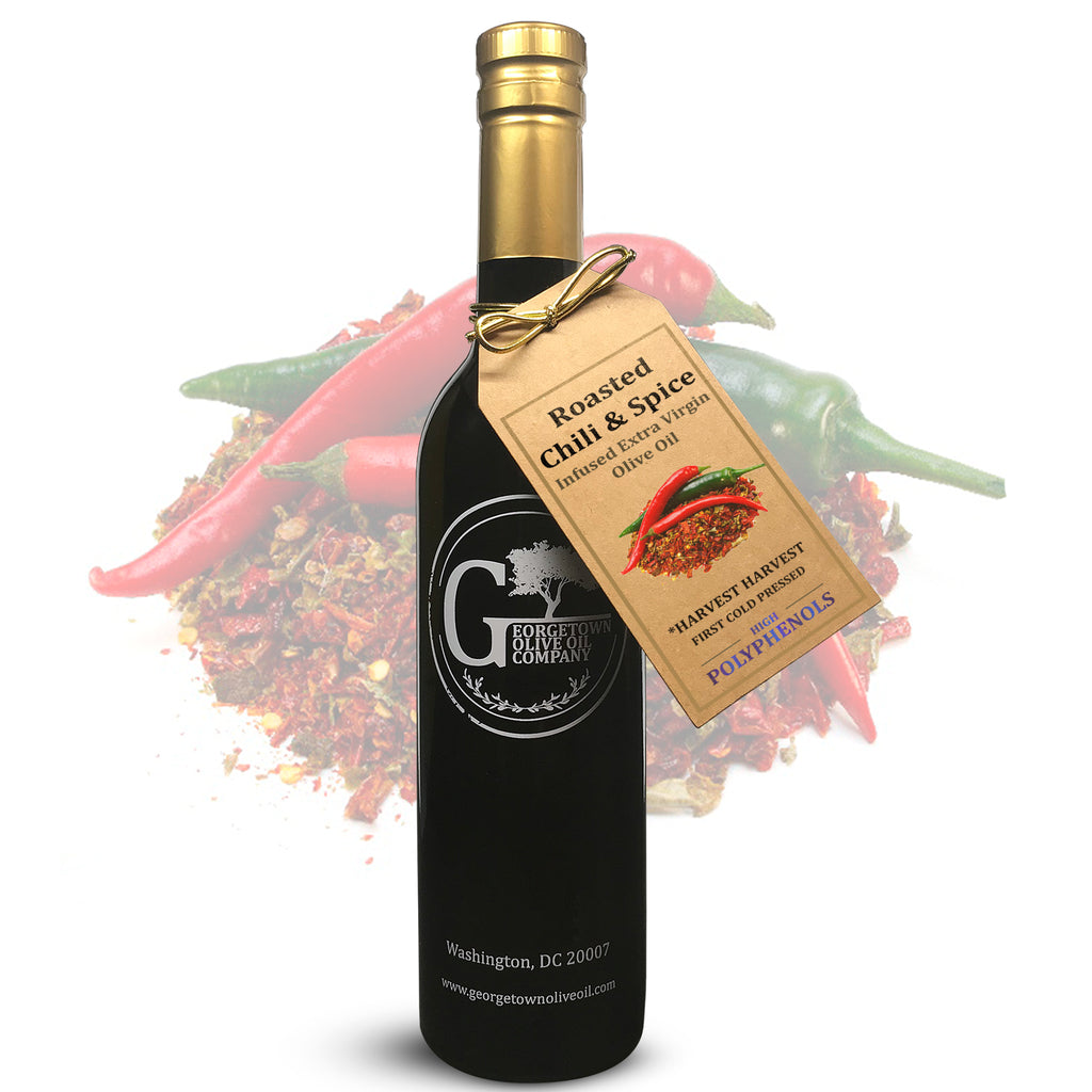 ROASTED CHILI & SPICE Infused | High Polyphenols Extra Virgin Olive Oil is bold, spicy, layered, yet simple and suitable to the palate. In this infusion, we've combined the full flavor and heat of cumin, caraway, and roasted chipotle peppers. Great for roasted meats, vegetables, sauces, marinades, burritos, and tacos.