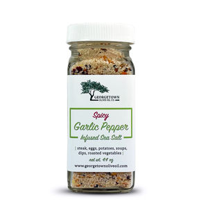 Spicy Garlic Pepper Sea Salt - a spicy blend of habanero, garlic, and red peppers; this salt is great on steak, tacos, beef, pork, chicken or vegetables.